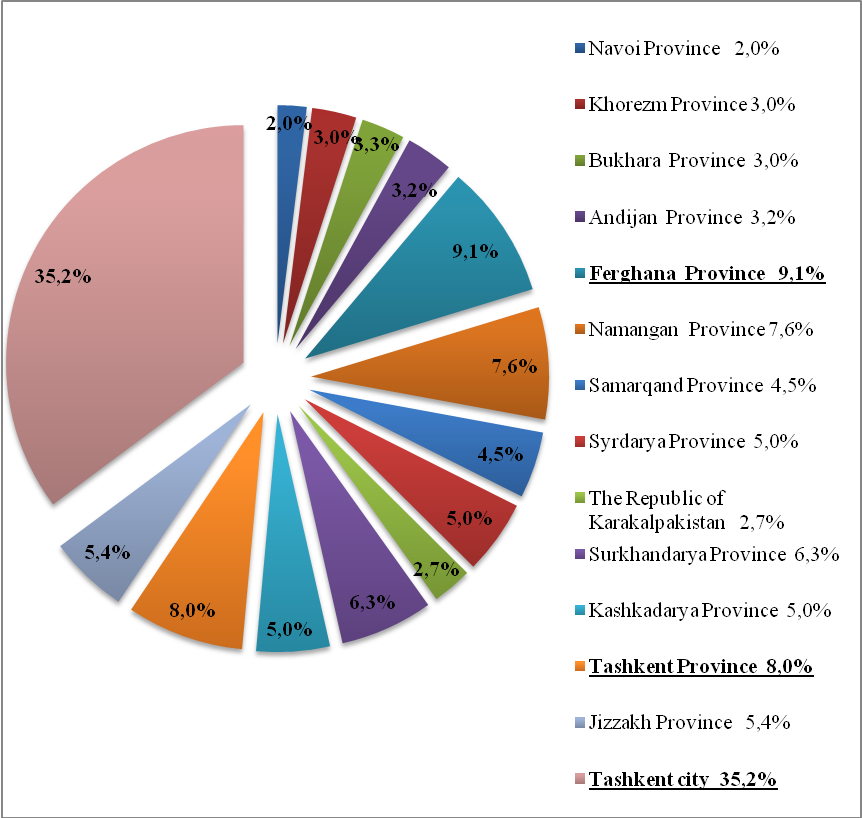 The leasing operations are distributed through the Republic evenly enough, except for the Tashkent city, which accounts for 35.2% of all new leasing transactions at the domestic market. According to the results of the first half-year, 2017, the Fergana Province (9.1%) and the Tashkent Province (8.0%) are the leaders.