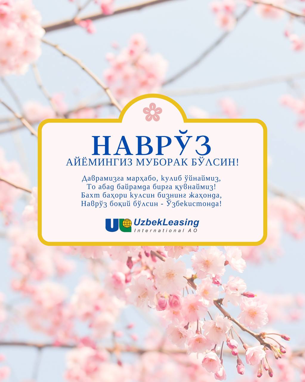 Тун билан кун тенглашадиган кунда нишонланадиган, халқимиз учун шарқона янги йил - Наврўз айёми муносабати билан "Uzbek Leasing International A.O." компанияси жамоаси самимий муборакбод этади!